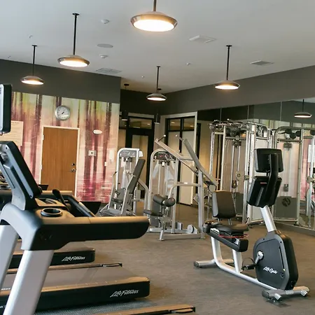 Guests can work out in a fitness room or relax by a swimming pool.